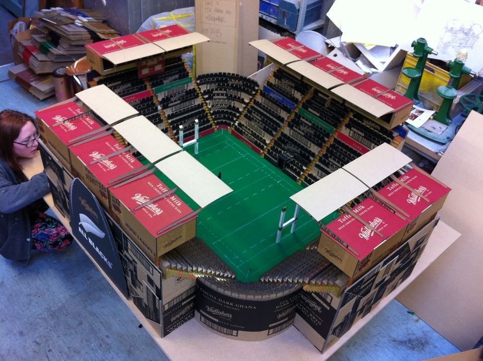 Miniature stadium modelled from chocolate boxes produced for a Whitakers advertising campaign.