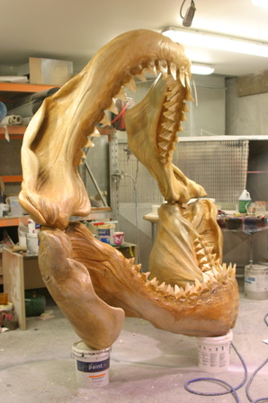 This megalodon floor installation covered 100 sqm in painted plywood tiles, joined by layer of stringers and packers underneath. The 3D life size dorsal fin and tail mounted onto this.