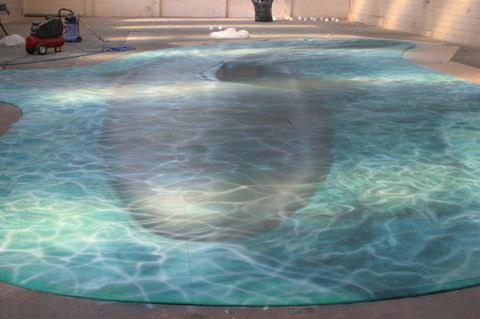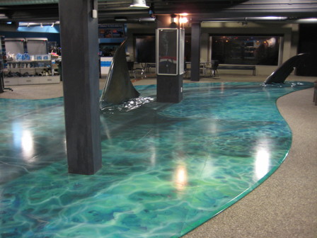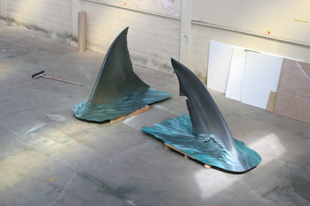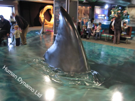 This megalodon floor installtion covered 100 sqm in painted plywood tiles, joined by layer of stringers and packers underneath. The 3D life size dorsal fin and tail mounted onto this.