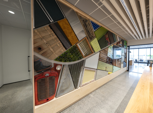 "I took a bird's eye view of farmland as a whole. Individually paddocks are portrayed by individual materials, chosen for their texture, form, colour and relevance. These panel or fields simulate pasture, crops, and land in different states. This choice of materials is confined to ones that are recognizable and relatable to agricultural and horticulture sectors. Building a bridge between the bank and their core clients. But also presented an artistic branding to all customers, visitors and staff. The spacial artwork aims to be a talking point and promote connection and sense of belonging. In turn relaxing those in this coffee station and ‘kitchen table’ zone of the bank offices.